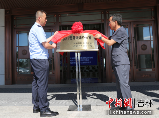 當(dāng)天,琿春林區(qū)法院黨組書記、院長(zhǎng)鄭國(guó)榮與琿春森林公安分局黨委書記、局長(zhǎng)李本三共同為“執(zhí)行警務(wù)聯(lián)動(dòng)辦公室”揭牌。兩家單位黨委成員以及40余位干警參加了揭牌儀式。揭牌儀式后,大家共同觀摩“執(zhí)行警務(wù)聯(lián)動(dòng)辦公室”操作流程。