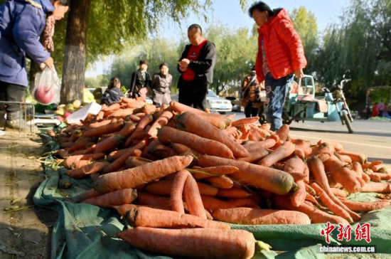 10月16日,吉林長春,市民在挑選胡蘿卜。當下正是中國東北民眾“囤秋菜”的季節(jié),滿載大蔥、白菜、胡蘿卜等秋菜的貨車停靠在長春市區(qū)指定銷售區(qū)域,市民們穿梭挑選,忙碌地儲備過冬秋菜。中新社記者 張瑤 攝
