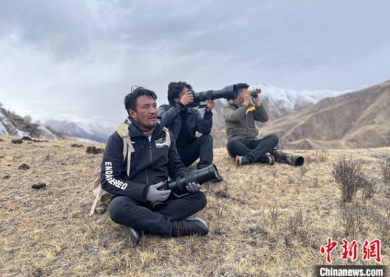 資料圖為3月22日,達(dá)杰(左一)與其他牧民攝影師一同拍攝野生動物。 中新社記者 李江寧 攝