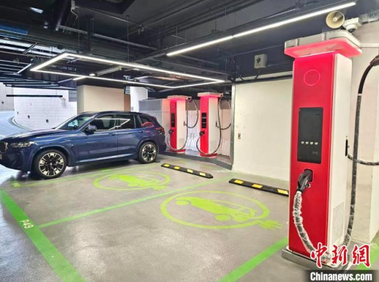 圖為華為在香港將軍澳藍(lán)塘匯商場停車場內(nèi)設(shè)置的充電站!∠愀廴A為國際有限公司供圖