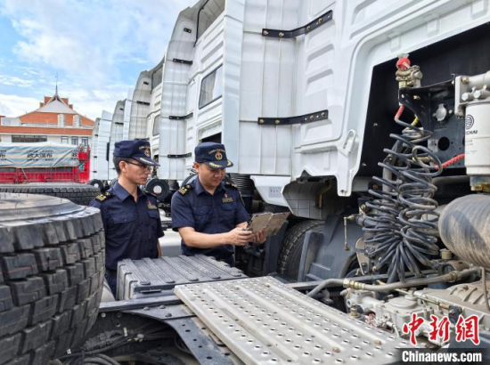 海關(guān)關(guān)員在關(guān)累港口岸對出口重卡牽引車開展查驗。 康明 攝