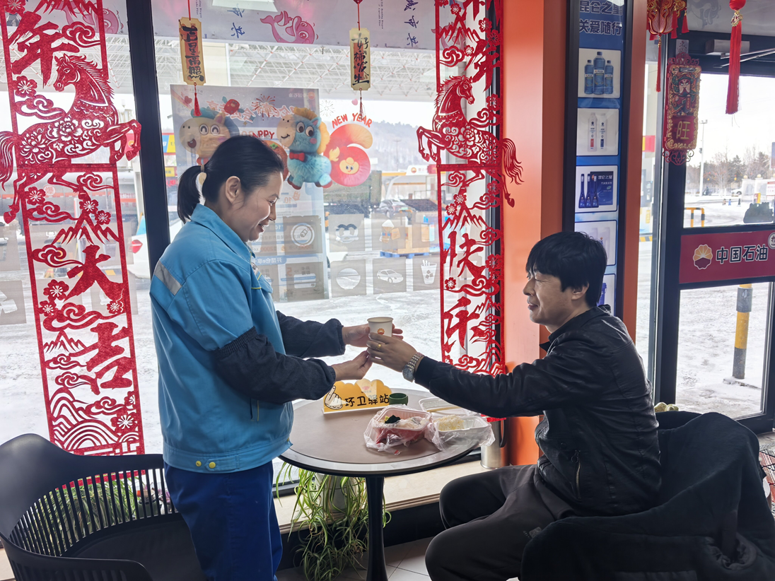 2月24日,節(jié)后返工返程客流持續(xù)攀升,駕車(chē)返程的劉先生駛?cè)胫袊?guó)石油吉林銷(xiāo)售公司四平分公司九間房加油站,一杯熱氣騰騰的茶水便送到手中,劉先生高興地說(shuō):“路上喝杯熱茶,心里熱乎乎的。”