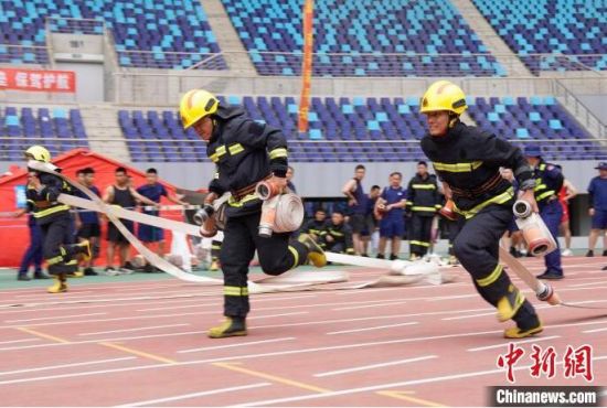 消防指戰(zhàn)員在進(jìn)行一人兩盤水帶連接!埇 攝