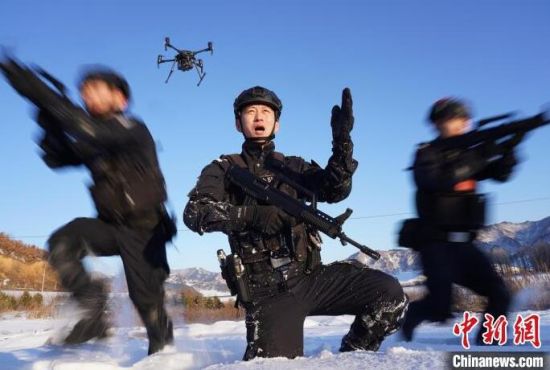 民警與無(wú)人機(jī)協(xié)同進(jìn)行抓捕演練。鄭博文 攝