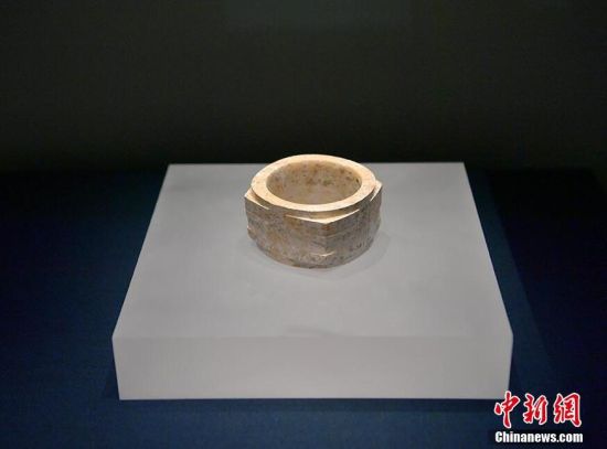 工作人員展示新時(shí)期時(shí)代良渚文化玉琮(仿制品)。