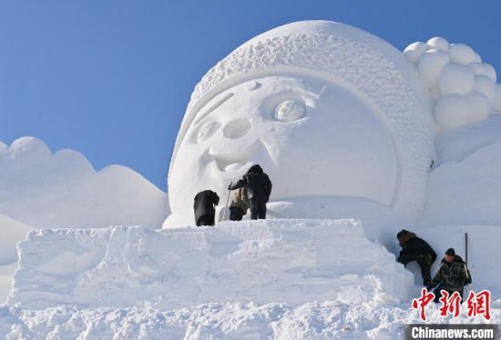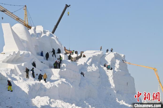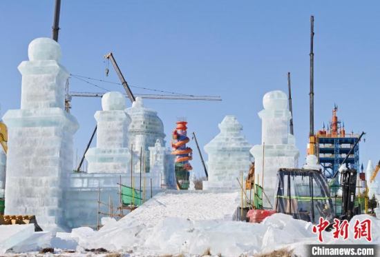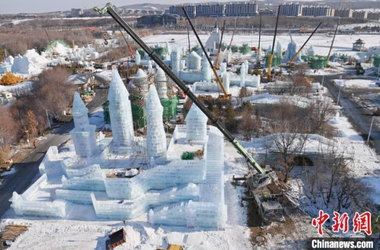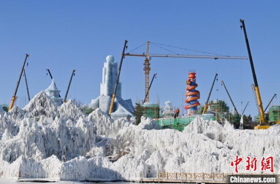 12月11日,吉林長(zhǎng)春,工作人員正在長(zhǎng)春冰雪新天地緊張施工。今年長(zhǎng)春冰雪新天地總占地面積達(dá)到156萬(wàn)平方米,冰雪雕塑200組創(chuàng)歷屆之最,并設(shè)置1314米的空中雪漂流、520米的冰滑梯等設(shè)施供中外游客游玩。中新社記者 張瑤 攝