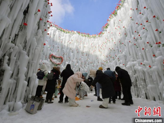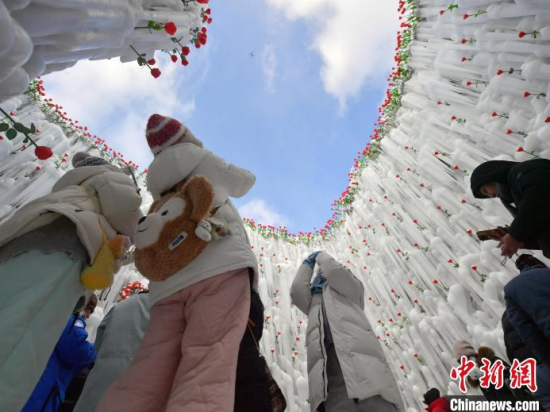 12月26日,吉林長白山,游客在冰洞內(nèi)打卡。進(jìn)入雪季,長白山推出“愛心冰封玫瑰”吸引大量游客打卡拍照,冰洞內(nèi)被玫瑰道具環(huán)繞,洞頂呈心形,充滿浪漫氣息。