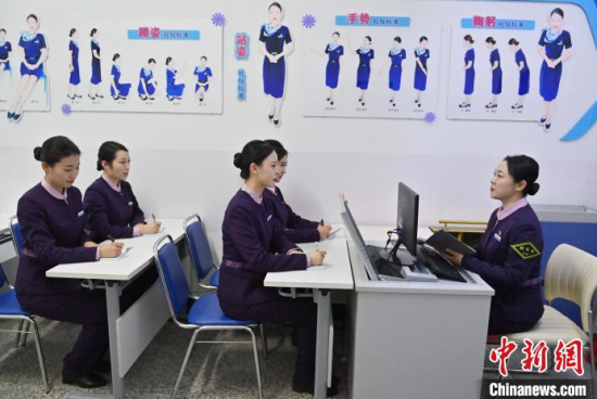 1月7日,吉林長(zhǎng)春,“動(dòng)姐”在進(jìn)行安全知識(shí)培訓(xùn)。春運(yùn)臨近,為提升服務(wù)品質(zhì),沈陽(yáng)局集團(tuán)公司長(zhǎng)春客運(yùn)段動(dòng)車一隊(duì)的乘務(wù)員們利用業(yè)余時(shí)間開展基礎(chǔ)禮儀、職業(yè)形象、服務(wù)技巧等內(nèi)容的培訓(xùn)。中新社記者 張瑤 攝