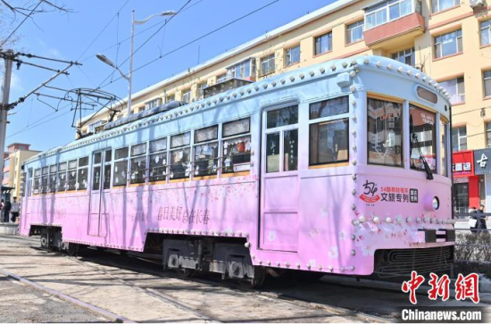 4月18日,吉林長(zhǎng)春,游客在54路文旅春日限定專列上拍照留念。該專列車廂內(nèi)外融入了桃花的設(shè)計(jì)元素,營(yíng)造出濃郁的春意,吸引了眾多游客前來(lái)打卡。中新社記者 張瑤 攝