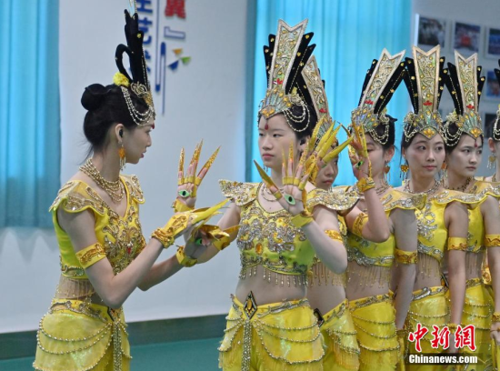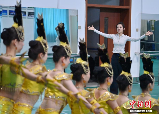 4月22日,在長春大學(xué)特殊教育學(xué)院,學(xué)生們?cè)谂啪殹肚钟^音》。這所學(xué)院擁有一支由29名聽障學(xué)生組成的舞蹈團(tuán)隊(duì)。他們因?qū)ξ璧傅臒釔鄱奂谝黄,在無聲的世界中舞出他們精彩的人生篇章。中新社記者 張瑤/攝