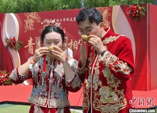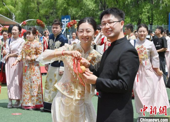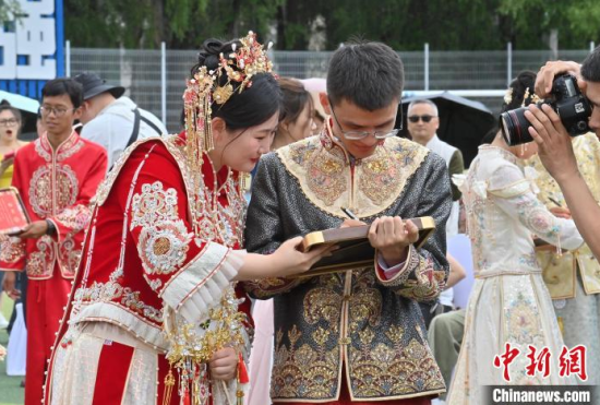 6月21日,吉林大學(xué)中心校區(qū)舉行2025年校友集體婚禮,36對(duì)新人從四面八方相聚在母校,在眾人矚目下有序步入婚禮主舞臺(tái),沿途得到學(xué)弟學(xué)妹們的熱情祝福。中新社記者 張瑤 攝