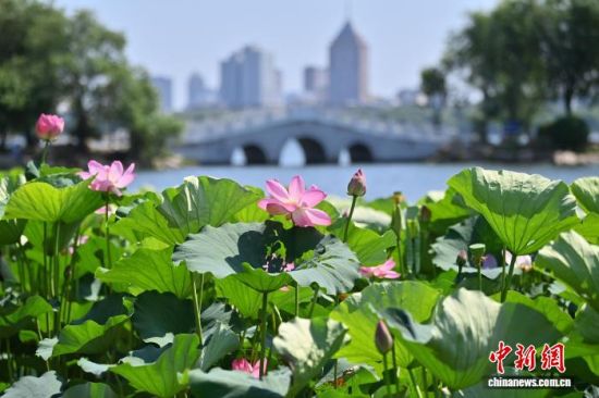 7月22日,吉林省長(zhǎng)春市南湖公園的4公頃荷花綻放,吸引市民與游客前來(lái)觀賞。 中新社記者 張瑤 攝