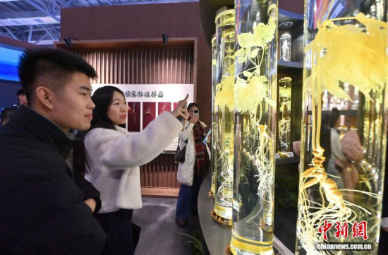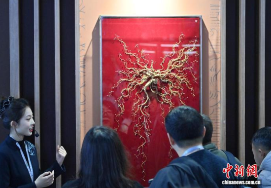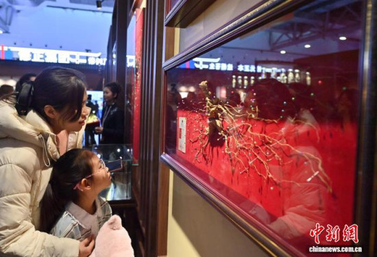 12月7日,吉林長春,參觀者在參觀人參。當日,2025長春國際醫(yī)藥健康產(chǎn)業(yè)博覽會開幕,具有當?shù)靥厣那暌吧絽ⅰ⑷藚吮驹谌藚⒄箙^(qū)展出,吸引了參觀者的目光。中新社記者 張瑤 攝